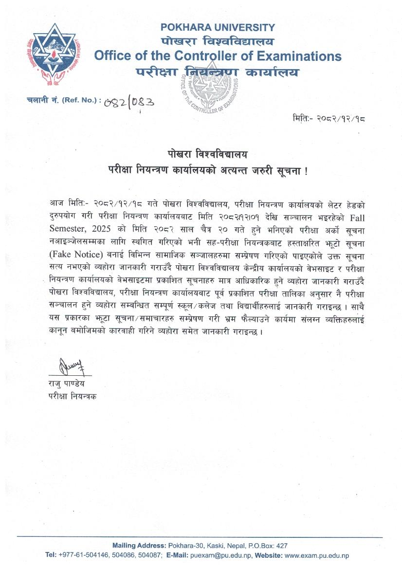 पोखरा विश्वविद्यालय परीक्षा नियन्त्रण कार्यालयको अत्यन्त जरुरी सूचना !